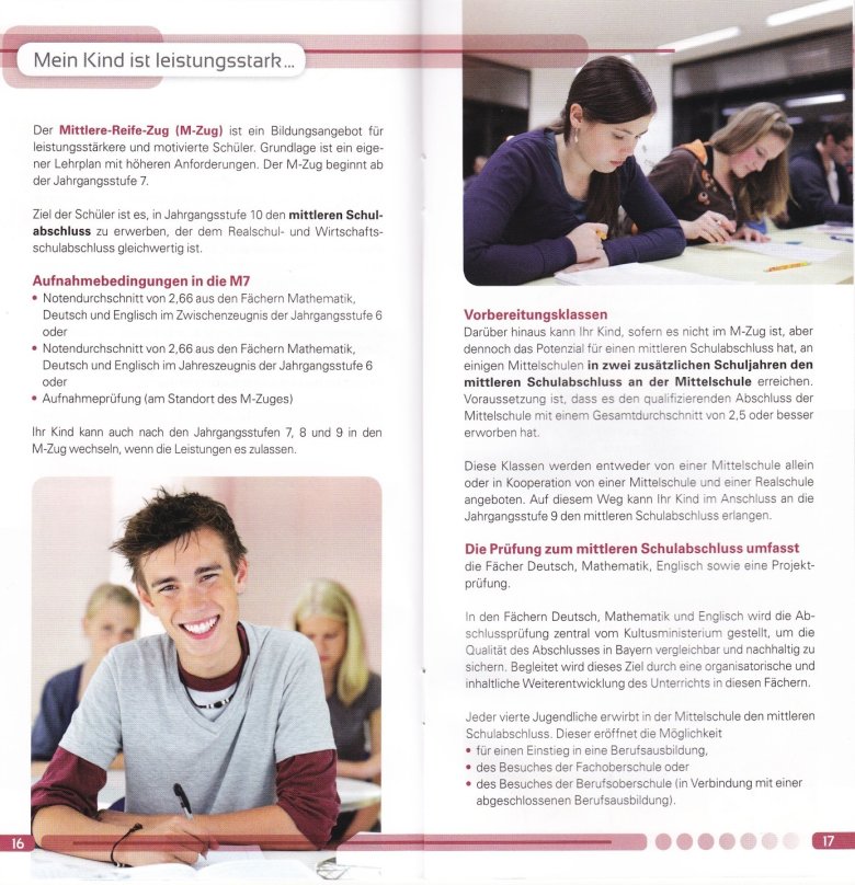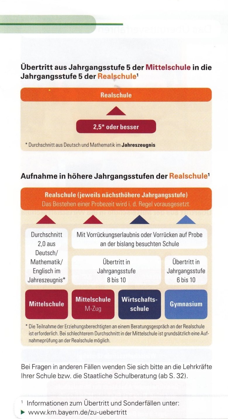 Die Möglichkeiten des Übertritts an eine weiterführende Schule haben wir den Broschüren "Der beste Bildungsweg für mein Kind" und "Die bayerische Mittelschule“ des Bayerischen Staatsministeriums für Bildung und Kultus, Wissenschaft und Kunst entnommen. Aktuelle Informationen zum Übertritt finden Sie auf der Website des Kultusministeriums unter folgendem Link.