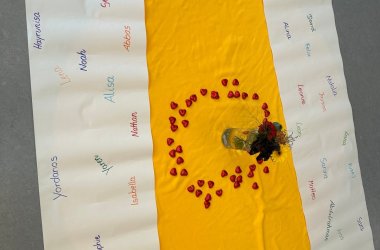 Gemeinsam haben wir symbolisch unseren Start gefeiert: Jede Schülerin und jeder Schüler fand seinen Namen auf einem langen Papierstreifen, der im Kunstunterricht gemeinsame mit allen gestaltet werden und dann unseren gemeinsamen Gruppenraum schmücken wird. Diese beiden Streifen zeigen allen: Wir gehören zusammen und wachsen als Team zusammen!
